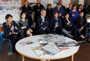 Concrètement, au collège Flavien, Mmes Miskovsky, professeure documentaliste, et Bath M’Wom, professeure d’histoire-géographie, encadrent une quinzaine d’élèves de sixième de la classe média. Les ministres assistent à un cours très vivant sur la fabrication de l’information. A partir du récent accident argentin, Mme Miskovsky montre comment l’information fabriquée par les agences de presse est traduite dans la presse écrite. Puis c’est au tour des élèves de fabriquer leur article pour Le Petit Flavien, le journal du collège, en interrogeant et en filmant les ministres. Les élèves interrogent les ministres sur leur parcours, leur relation aux médias. Mme Bath M’Wom nous explique qu’elle réutilise en cours d’histoire-géographie des apports de la classe média. Celle-ci aide les élèves à développer des compétences en lecture. Elle vient aussi en support pour le cours d’éducation civique où l’actualité est sollicitée. En histoire, mais en 4ème, les élèves ont réalisé des articles de presse sur la Révolution française.