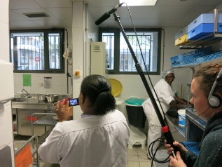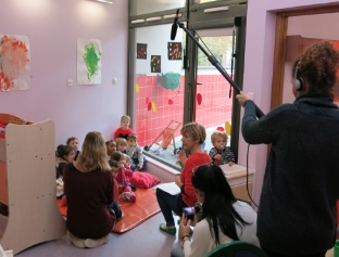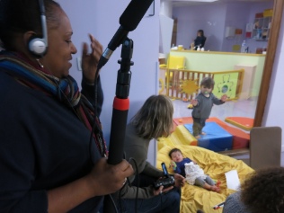 Chaque professionnelle fait un ou plusieurs plans à un poste technique différent : caméra (sur pied ou portée) et son avec la perche. La matériel de la crèche est utilisé.