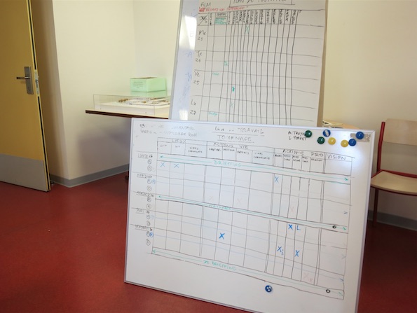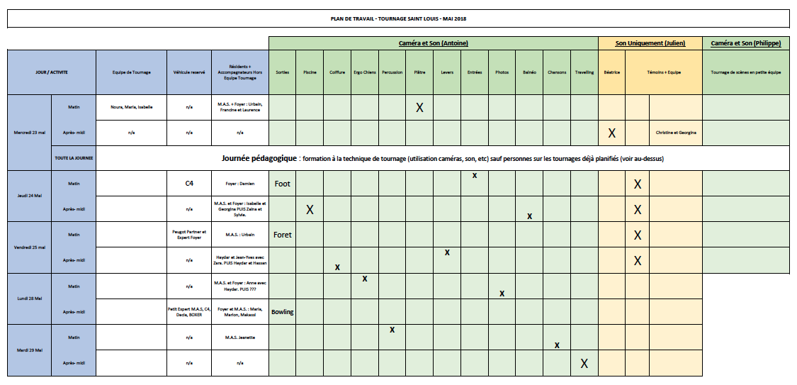 L’équipe apprend à faire un « planning » de tournage. Nous pouvons retrouver toutes les séquences à filmer, anticiper sur les actions, les disponibilités des personnes et les lieux à filmer. En un seul coup d’oeil nous pouvons voir l’ampleur du travail. Cela peut faire peur devant tant de travail et de concentration. C’est normal. Il faut rester humble. Nous pouvons nous aider avec des photographies de repérages, des témoignages, des essais que nous avons faits lors des séances préparatoires. Cependant seuls les intentions, le scénario doivent nous guider tout en sachant que lors du tournage beaucoup d’événements non prévus vont « surgir » ... Et c’est normal !