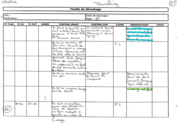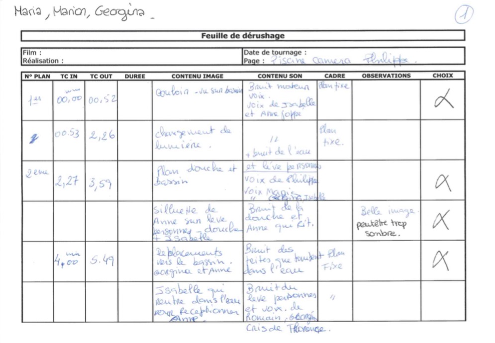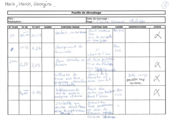 Un travail magnifique et très consciencieux a été fait par le groupe de l’Observatoire. Deux classeurs des feuilles de dérushage ont été remplis. Les groupes se sont bien répartis les tâches. Tous les plans tournés ont été visionnés avec une description et une notation. Le regard collectif permet de devenir le « premier spectateur et aussi l’auteur ».