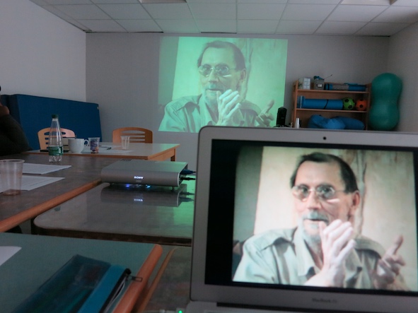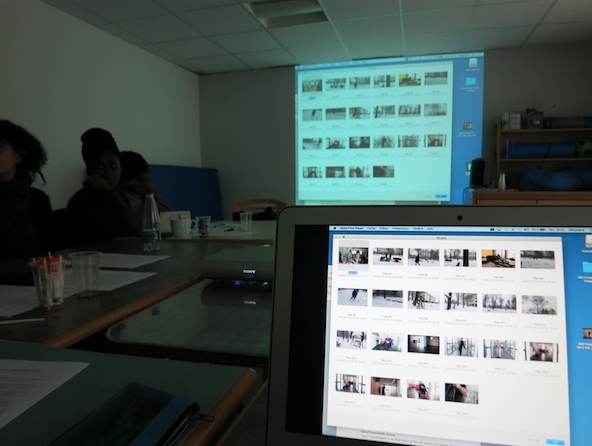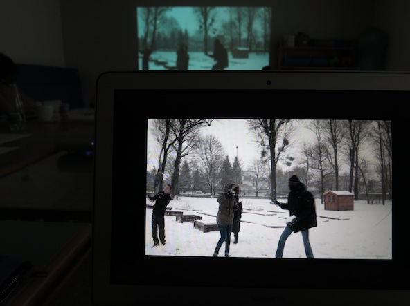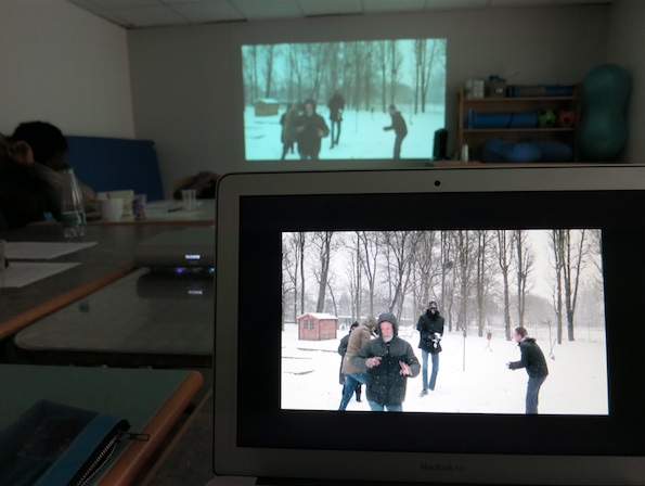 Les groupes A + B regardent collectivement les images tournées par les équipes qui ont pris tour à tour la caméra et le micro.