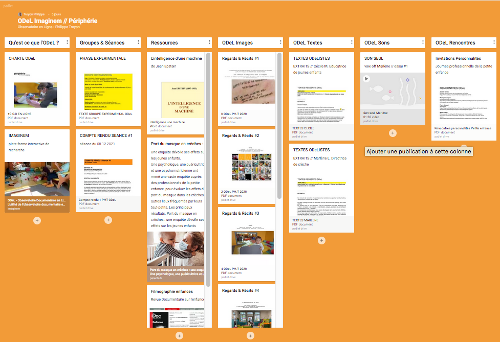 RAPPEL : Cette interface va nous permettre de rassembler et conserver en commun tous nos documents qui nous aideront dans la construction de notre réflexion autour du CONFINEMENT 1 (vous y retrouverez également le Point de la séance 1). Guillaume et moi-même « joueront » également le jeu de l’alimentation de cette interface PADLET.