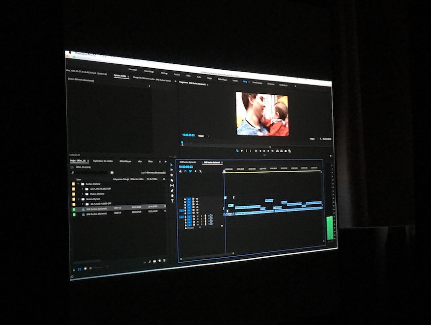 Guillaume Lebel, chef-monteur a préparé la séance en intégrant toutes les images et les sons enregistrés par les professionnelles à l’aide leurs téléphones portables. Il y a 2 heures de matériels. Il parle de sa méthode de travail et de son outil de travail. Il se sert du logiciel de montage Adobe Première.